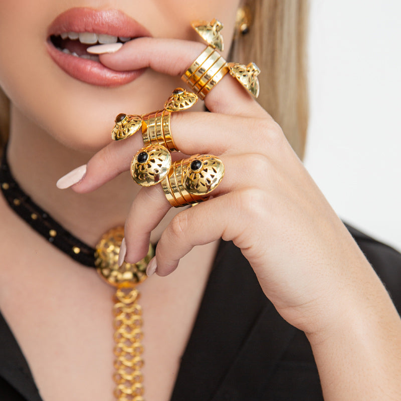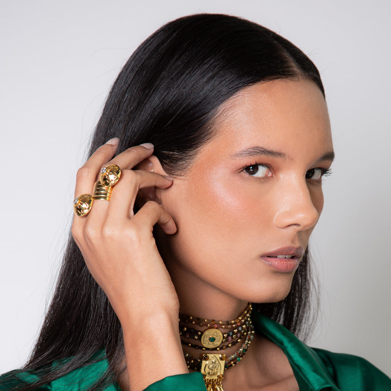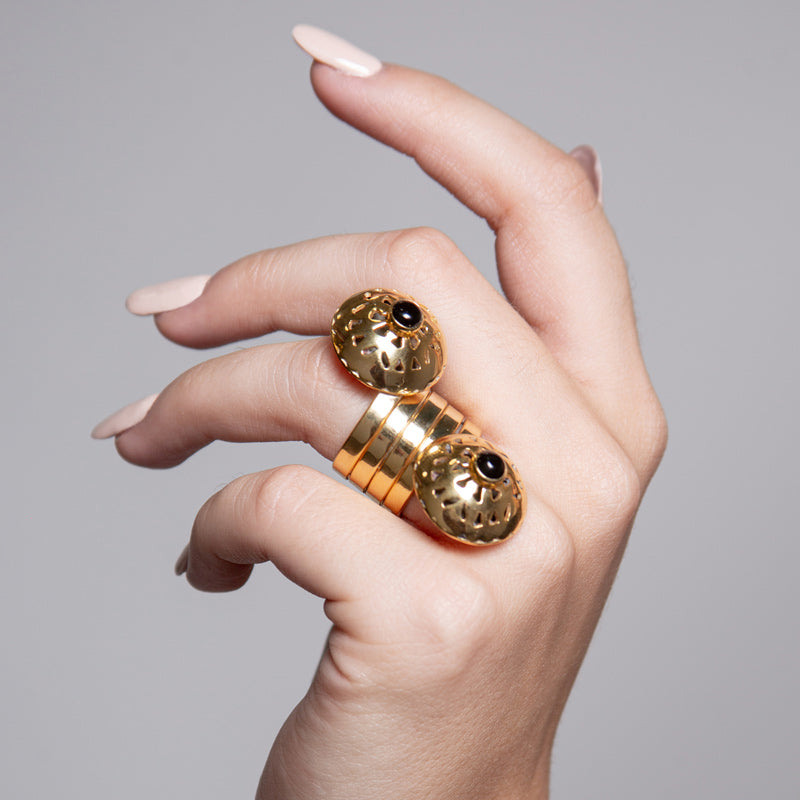This double mandala ring is crafted from brass with a Cyanide-Free 24 k Gold plated brass by jeweler Claudia Corrie.