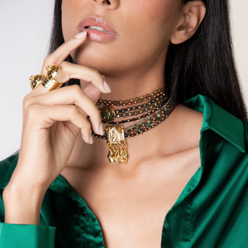 It features an elegant openwork mandala design with central gemstone settings of zirconia, onyx or tiger's eye. It's an artisanal high jewelry piece that combines mandala symbols with precious stones in a luxurious finish.