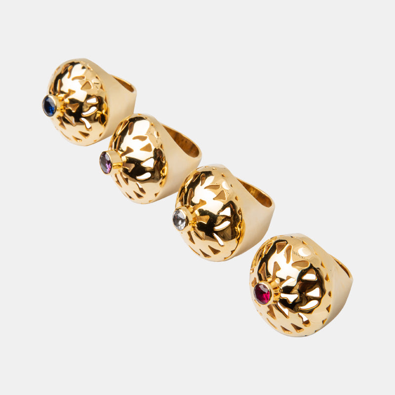This striking Mandala ring designed by Claudia Corrie is crafted in 24k gold-plated brass and features multicolored zirconias and a black onyx.